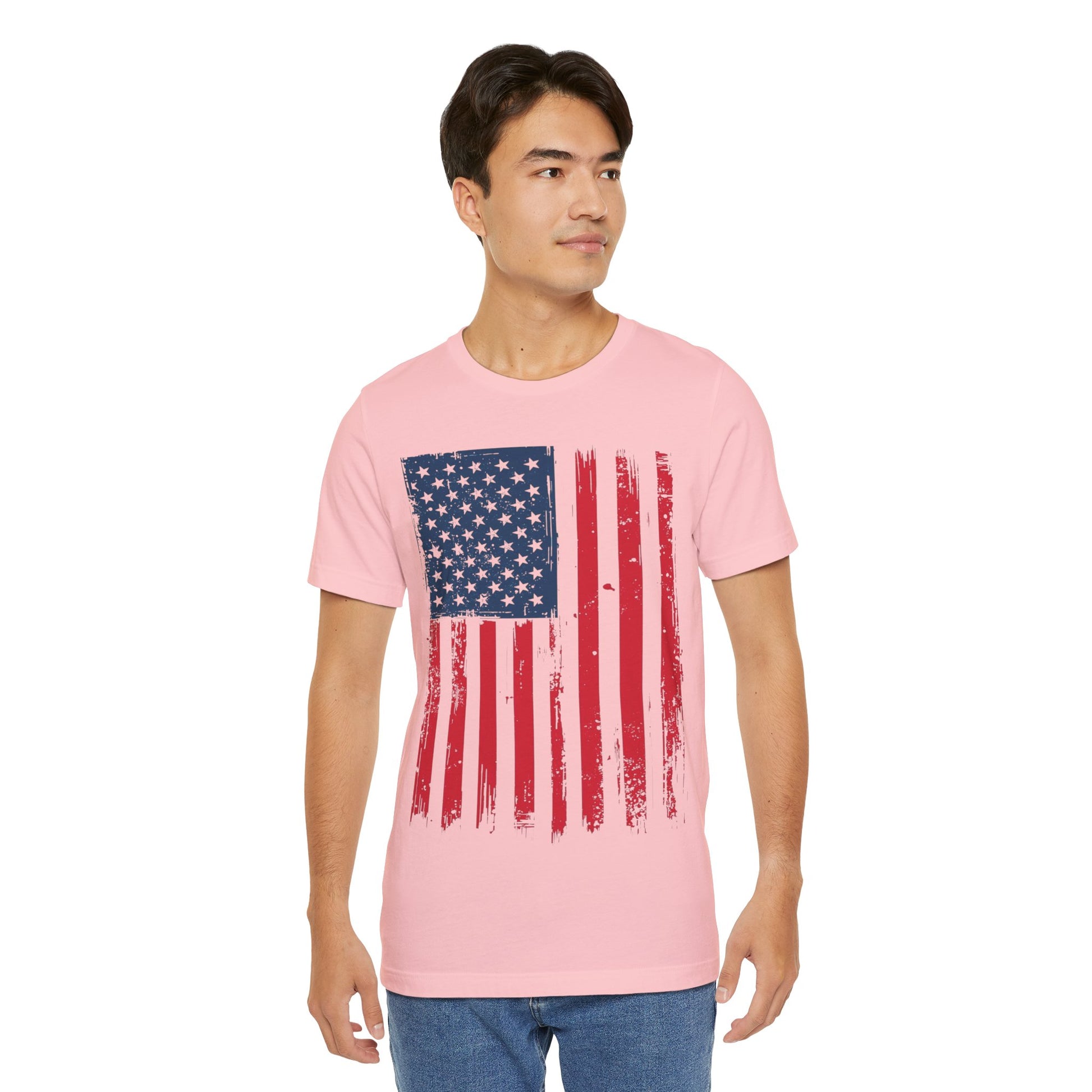 Celebrate your individuality and express your love for your country with this stylish unisex jersey short sleeve tee. Crafted from 100% Airlume combed and ring-spun cotton, this lightweight and breathable top is perfect for all-day wear. Whether you're heading to a casual outing, a summer barbecue, or enjoying fireworks on July 4th, this tee blends comfort with a classic fit. Designed for everyone, it’s perfect for family gatherings, patriotic events, and even everyday adventures. With a vibrant and crisp design featuring a distressed American flag, it radiates a sense of freedom and pride, making it a great gift for friends and family who cherish their heritage or love casual, laid-back wear.