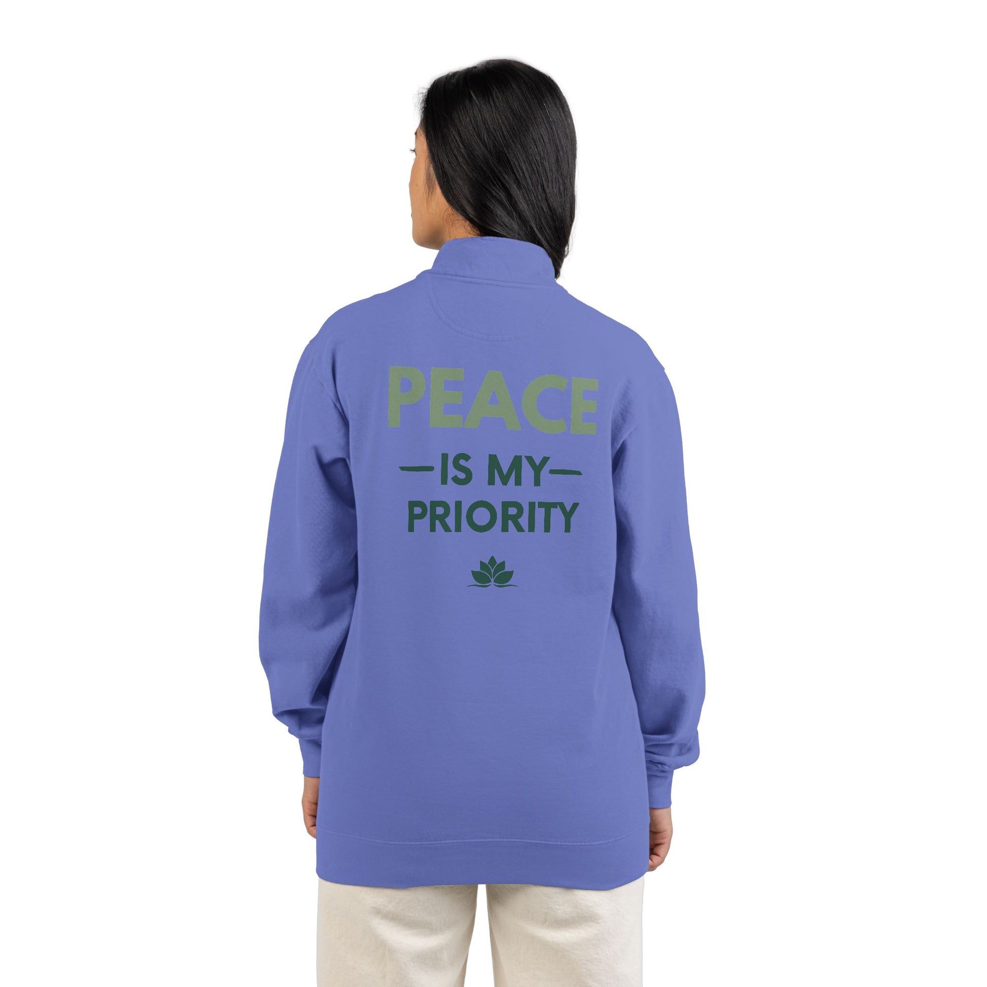 Calm, sturdy, and quietly confident — this quarter-zip sweatshirt carries a simple message across its back: PEACE IS MY PRIORITY. The heavy 9.5 oz fabric feels substantial without being stiff, folding into the lined collar and relaxed silhouette for an easy, lived-in look. Rolled-forward shoulders and side seams give it natural movement and shape; ribbed cuffs and waistband with spandex keep everything sitting right after you pull it on. The muted, earthy colorway and restrained typography fit into slow mornings, long walks, and moments when you choose stillness over noise. Wear it around town, on a retreat, or layered for a low-key gathering — it’s built to be reached for when you want comfort that speaks your values.