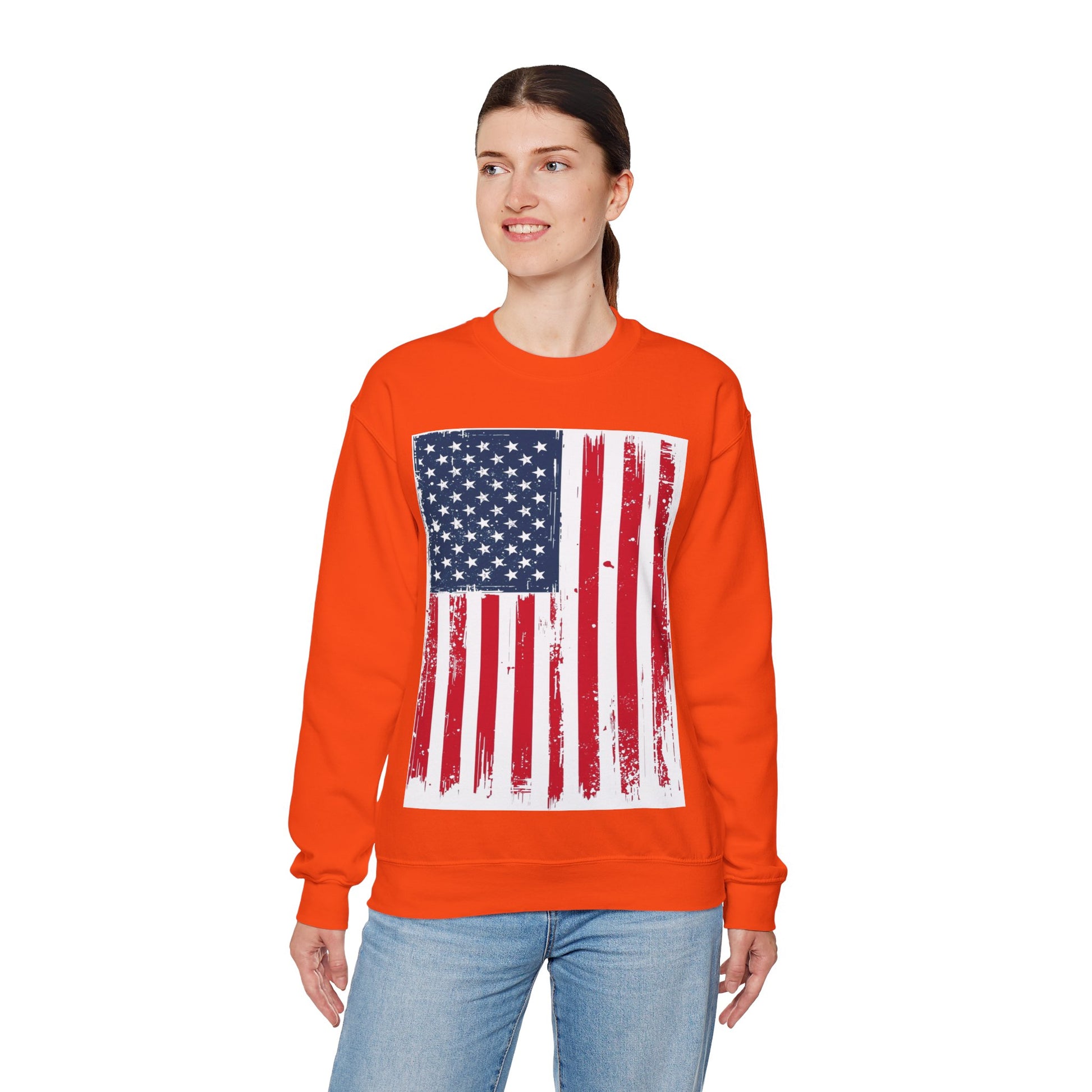 This USA Flag sweatshirt is perfect for those who want to show their patriotism in a cozy and stylish way. Ideal for adults looking for a comfortable and durable piece of clothing to wear during patriotic holidays and events.